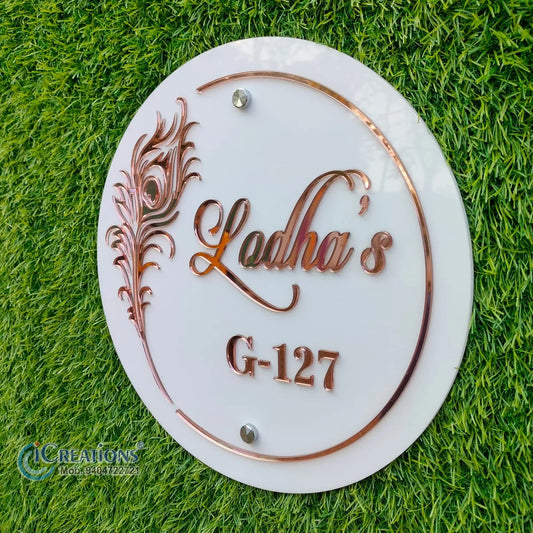 Gold Name Plate with Peacock Feather & Flute Design