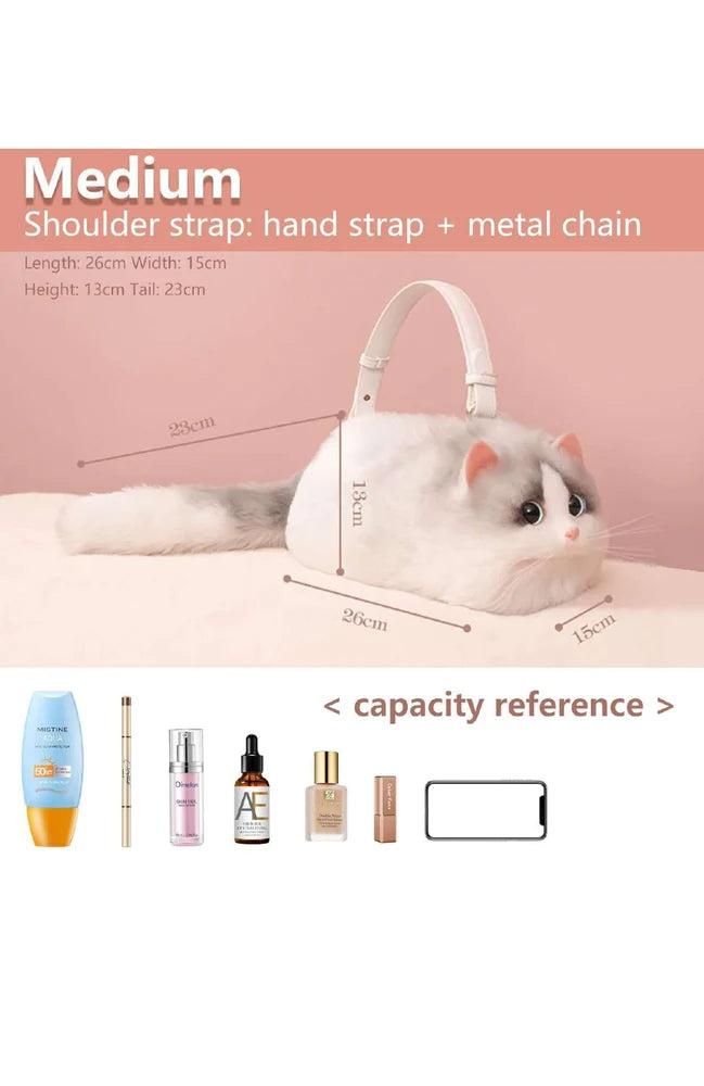 Carry your love for felines with our adorable Shaded Silver Kitty Handbag, crafted from luxurious faux fur to mimic a real cat! This charming accessory isn't just a purse; it's a delightful conversation starter that adds a playful touch to any outfit. Choose from three versatile sizes, perfect for wearing as a shoulder bag, crossbody, or simply carrying by hand. Its clever design includes a convenient top zipper for easy access to all your essentials.